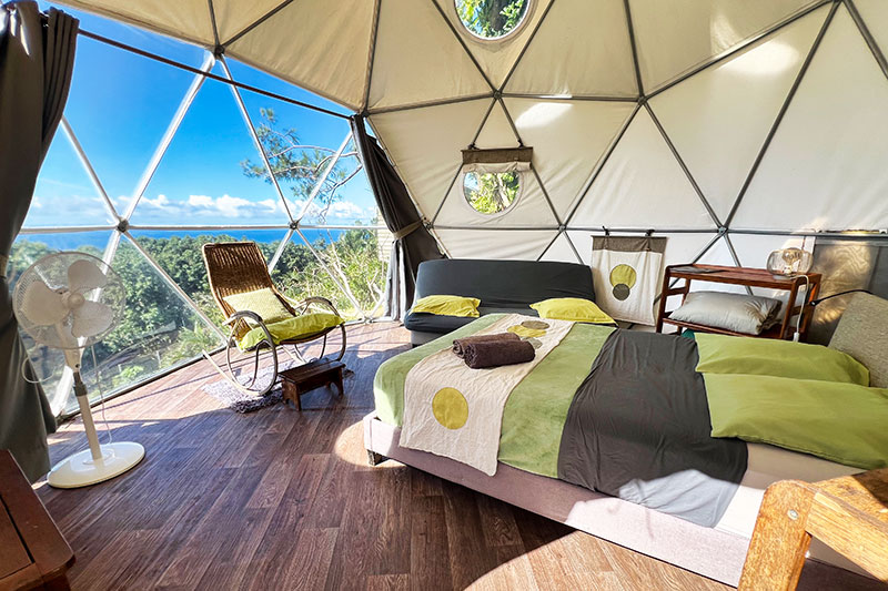 Le dôme est aménagé avec un lit double de 140, un canapé lit deux places, une table basse, chaise à bascule et des étagères de rangement.