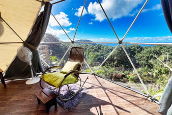 Le dôme Zen offre une terrasse en bois avec transats au milieu de plantes tropicales.