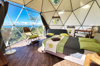 Situé sur une Plateforme en hauteur, il est composé d’un dôme de 3m60 de haut sur 18m2, d’une salle de bain, de toilettes ainsi qu’une cuisine équipée et un coin repas couvert.