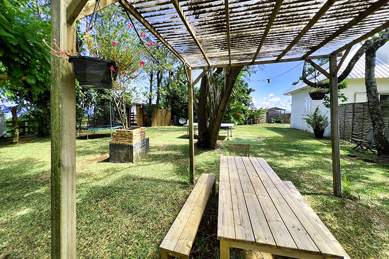 Il est équipé d’une table de ping pong, un trampoline, des petits jeux d’extérieur, d’un espace Barbecue à charbon et d’une grande table en bois.