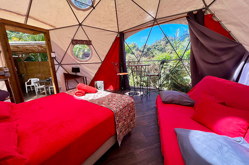 Le dôme est aménagé avec un lit double de 140, un canapé lit deux places, une table haute avec deux chaises et des étagères de rangement.