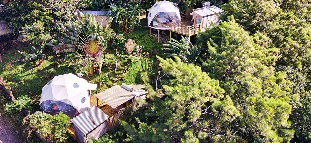 Situé sur une Plateforme en hauteur, il est composé d’un dôme de 3m60 de haut sur 18m2, d’une salle de bain, de toilettes sèches ainsi qu’une cuisine équipée et un coin repas couvert.